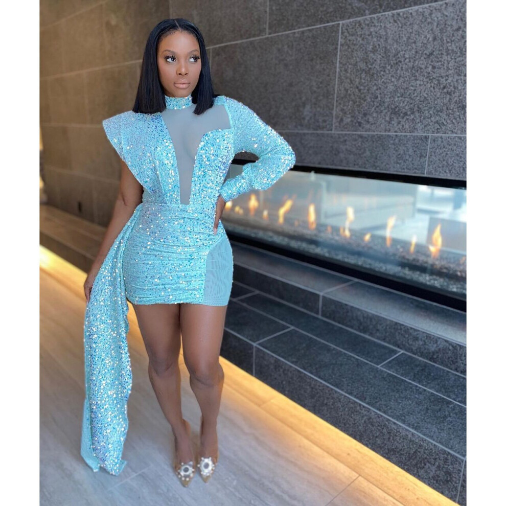 Women Mesh See Though Patchwork One Long Sleeve Sequined Ruffles Side Bodycon Dress Sexy Night Party Clubwear Dresses