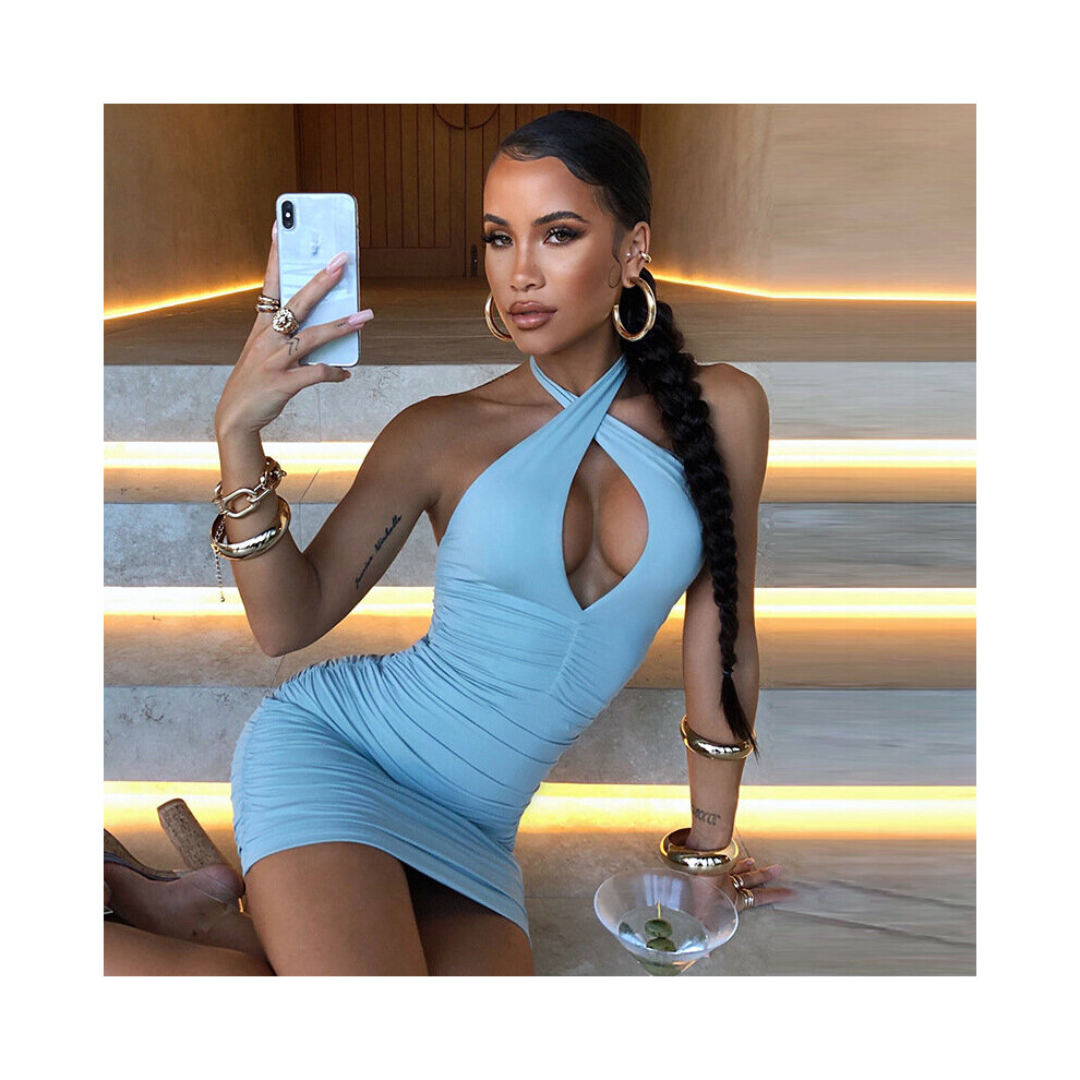 Solid Bodycon Mini Dress for Women Summer Sexy Halter Backless Hollow Out Ruched Short Dresses Night Party Clubwear