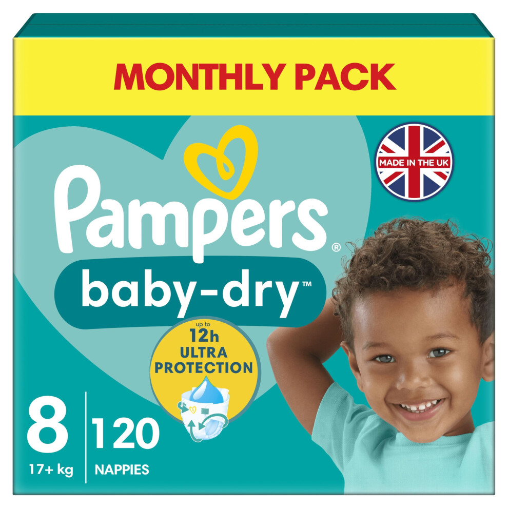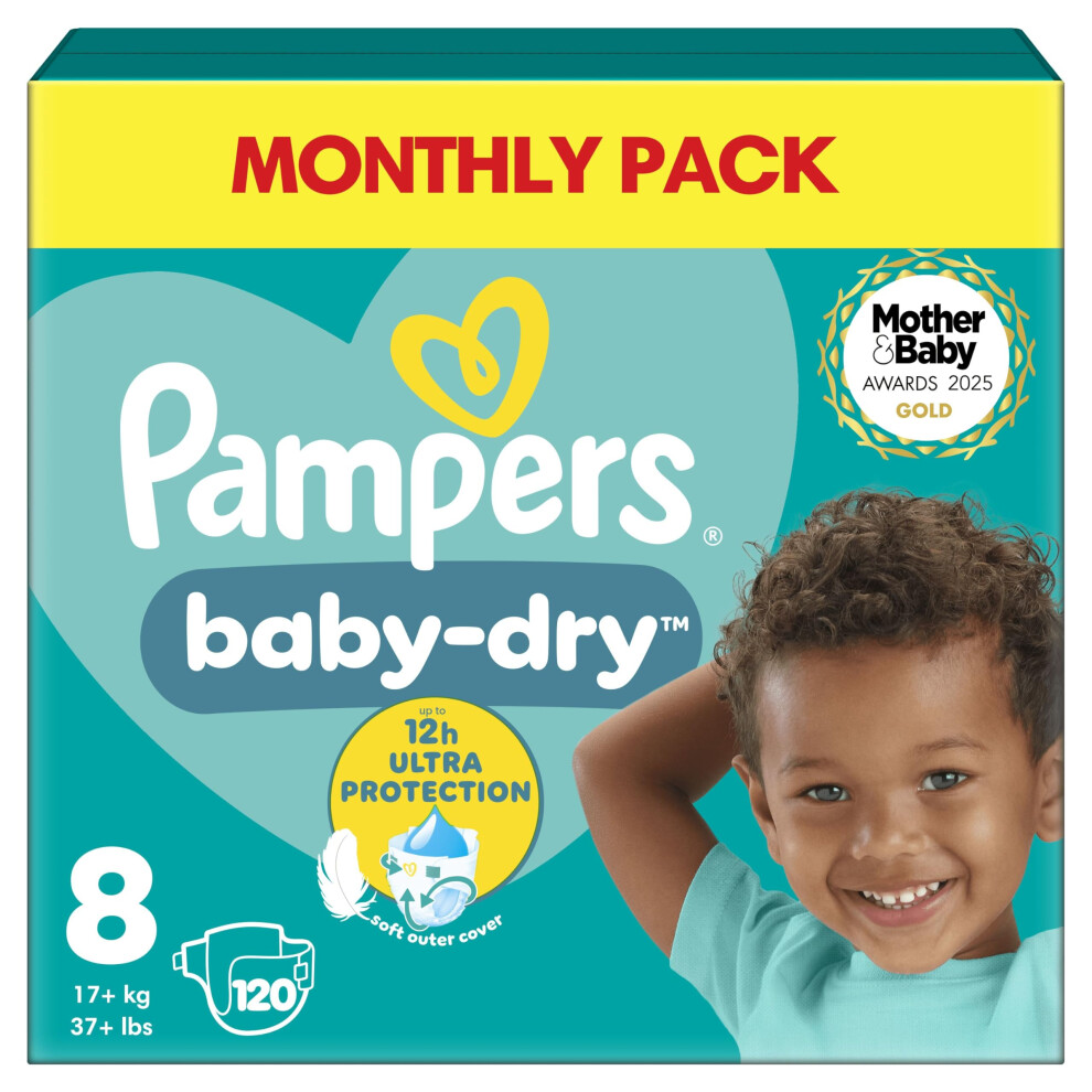 Pampers Baby-Dry Size 8, 120 Nappies, 17kg+, Monthly Pack, Up to a 100% Leak-Free Night