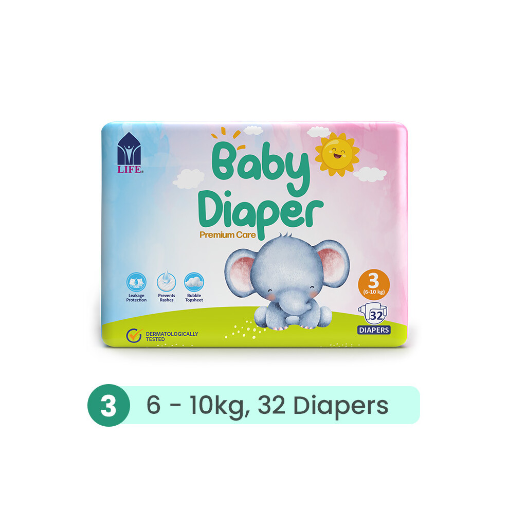 Life Baby Diapers Size 3 Medium (6-10kg) 32's Soft, Comfortable & Highly Absorbent Nappies for Babies with Day & Night Protection