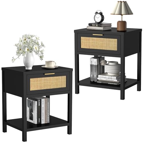 Eumyviv Nightstand Set of 2, Tall Side Table, Rattan End Tables with Drawer & Shelf, Boho Bedside Table, Modern Night Stand for Living Room, Bedroom, Small Space, Black