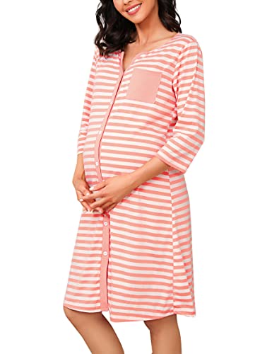 Sykooria Women's Maternity Nightdress Breastfeeding Nightwear Short Sleeve Nursing Nightgown Button Down Sleep Shirt V Neck Pajama Tops Soft Loungwear For Pregnant Women(Stripe Pink,M)