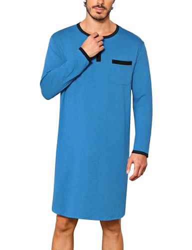Uniexcosm Men's Long Sleeve Pajama Tops, Nightshirt for Men Button Round Neck Sleep Shirt Nightgown Nightwear Nightdress Sleepwear Loose Fit for Casual Hospital Home Blue