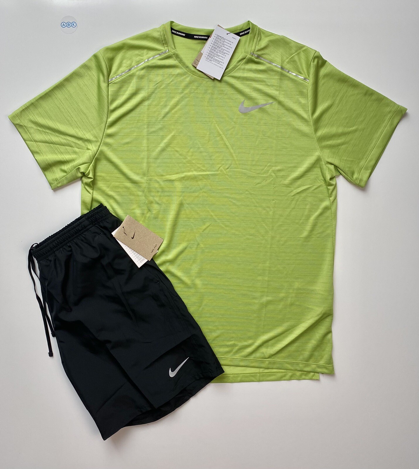 Nike Miler 1.0 T Shirt + Brief Lined 7” Shorts Gym Running Set Green Black Large