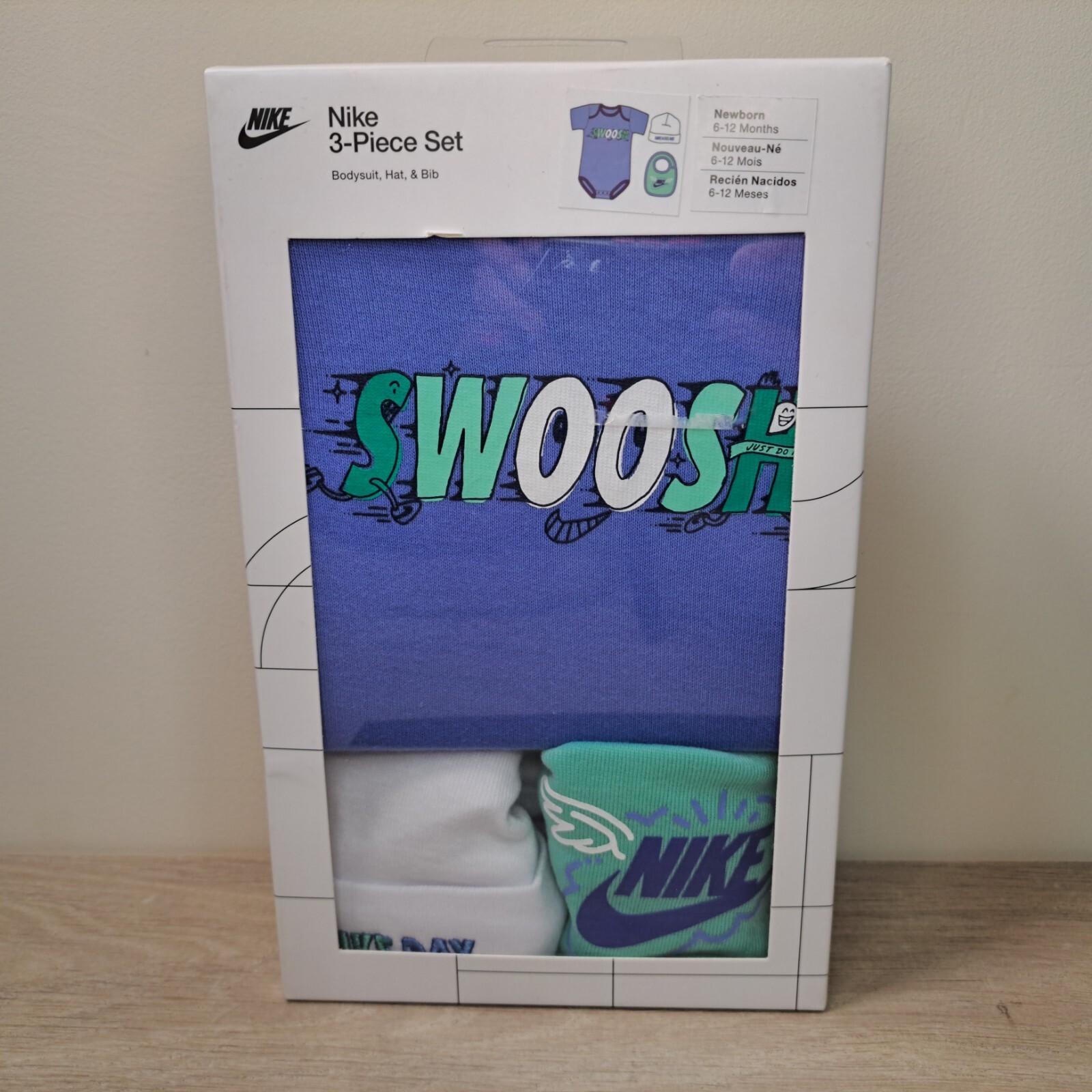 Nike Baby Outfit Gift Set 6-12M 3 Piece Blue Green 'Swoosh' Bodysuit, Hat & Bib