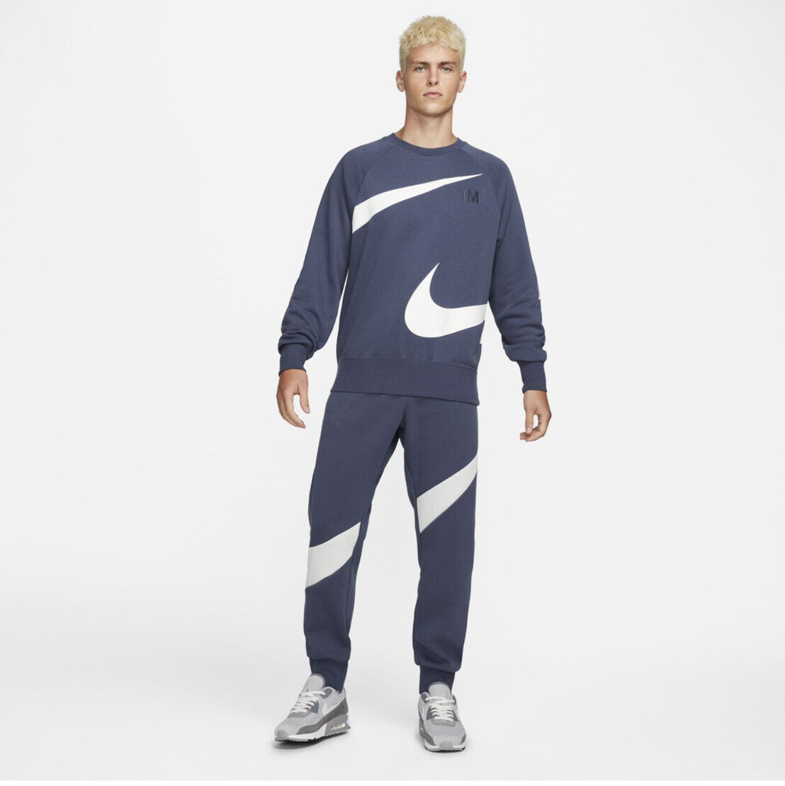 Nike Brushed Big Swoosh Fleece Pullover Crew Neck Jumper Blue White Size Large