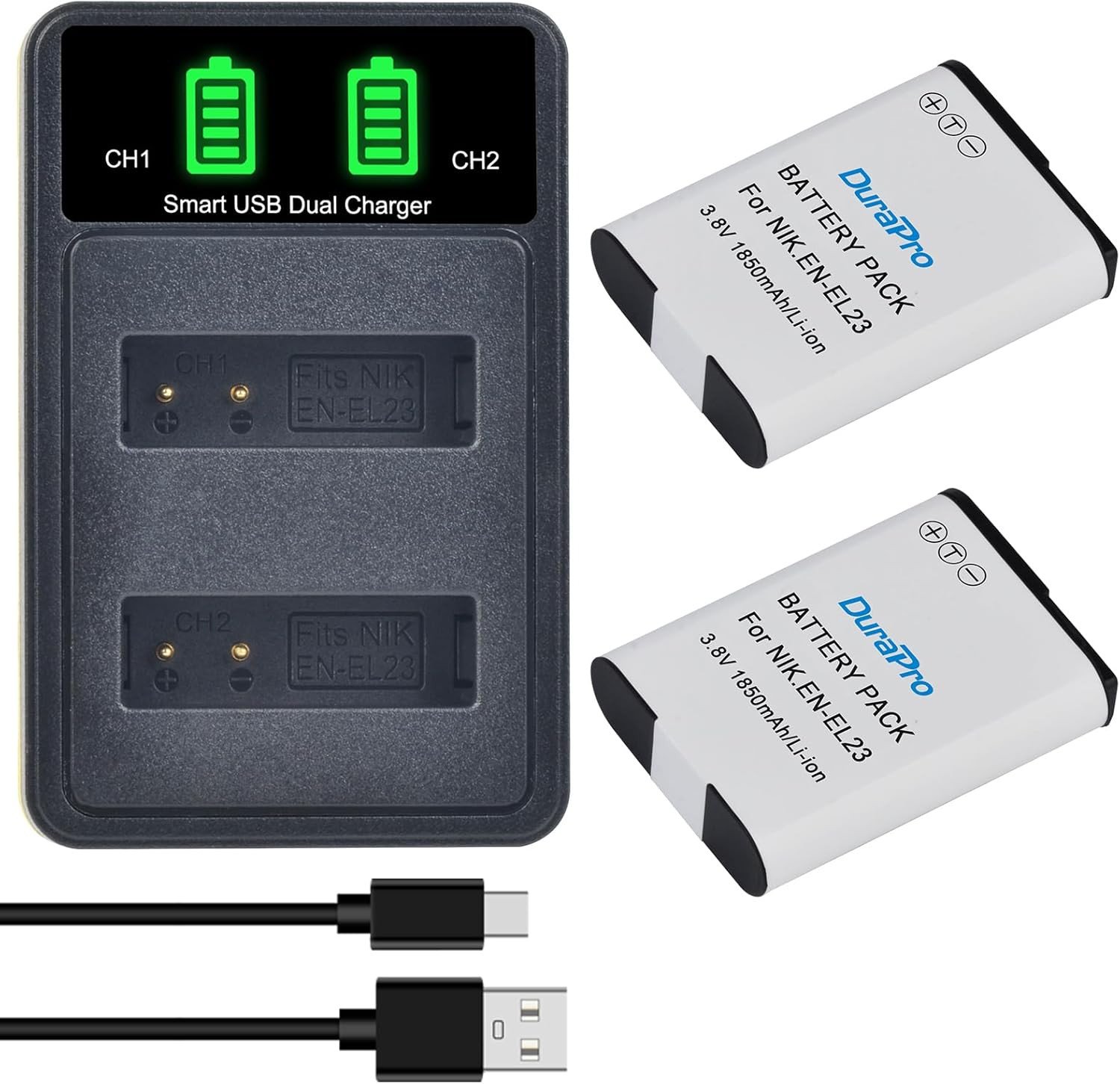 Durapro 2Pcs 1850Mah EN-EL23 EN EL23 Battery + Dual USB Charger for Nikon Coolp