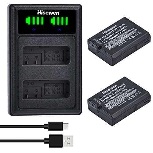 Hisewen EN-EL14 ENEL14a Battery 2 Pack and Dual Charger for Nikon D3200, D5600, D3100, D3500, D3400, D3300, DF DSLR, Coolpix P7800, P7700, P7100, P7000 Camera