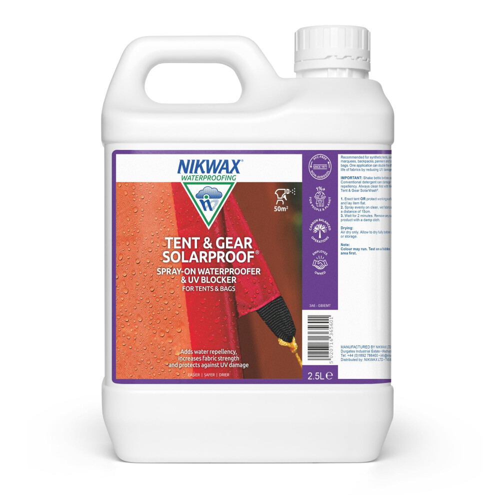 Nikwax TENT & GEAR SOLARPROOF Spray-on Waterproofer 2.5 L, Tent Waterproofing Spray and UV Blocker for Synthetic Weatherproof Textiles, Adds Water Repellency, Increases Fabric Strength