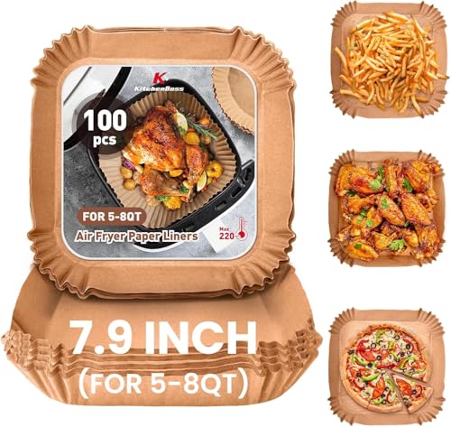 KitchenBoss 100Pcs Air Fryer Liners: 8Inch/20cm Square Airfryer Liner Disposable, Non-Stick, Greaseproof, Food Grade Paper for Air Fryer Baskets, Compatible with Ninja, Tower, Cosori