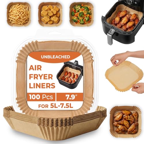YQL Air Fryer Liners Square for COSORI 5.5L-6.4L, 100pcs Disposable Airfryer Accessories 7.9Inch for Basket 5L-7.5L, Non Stick Parchment Paper for Tefal Easy Fry 5L-7.5L/Ninja Speedi/AF180UKCP/Philips