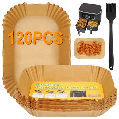 YQL 120pcs Air Fryer Liners for Ninja Dual/Tower, Disposable Air Fryer Accessories Air Fryer Parchment Paper Liners & Oil Brush for Ninja Dual AF400UK/ AF300UK, Instant Vortex, Euary Dual Air Fryer