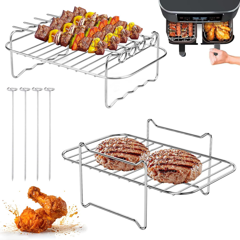 Omevett 2 Pcs Air Fryer Rack Stainless Steel Airfryer Rack with 4 Skewers Square Air Fryer Grill Rack Airfryer Accessories for Ninja Dual, Instant