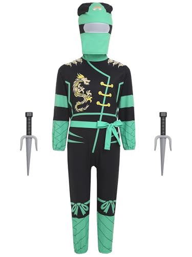 Manyakai Unisex Kids Halloween Dragon Tiger Ninja Cosplay Jumpsuit Outfits Dress Up with Headwear and Ninja Knife Green 8-10 Years