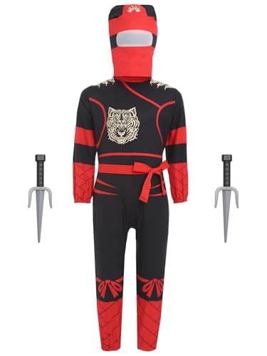 Manyakai Unisex Kids Halloween Dragon Tiger Ninja Cosplay Jumpsuit Outfits Dress Up with Headwear and Ninja Knife Red 5-8 Years