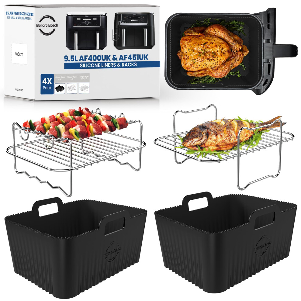 Premium Ninja AF400UK & DZ400UK Silicone Liners & Racks | 2.5mm Liner Thickness & 8mm high Silicone Lines on Base |4 PCS AF400UK Accessories | Specially Designed for Ninja Dual Air Fryer 9.5L
