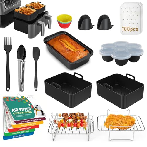 Air Fryer Accessories, 12 Pcs Air Fryer Accessories for Ninja Dual AF300UK AF400UK and Oven, Microwave,Including Reusable Silicone Dual Basket Air Fryer Liners, Air Fryer Racks,Cake Mould,Gloves,etc