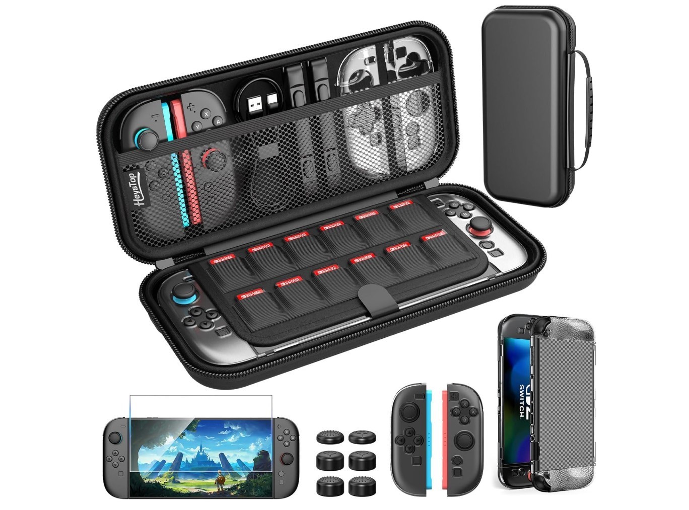 HEYSTOP Switch OLED Case for Nintendo Switch OLED Carry Case Pouch Accessories with Switch OLED Clear Cover Case Temperd Glass Screen Protector and 6 Thumb Grips Caps for Nintendo Switch OLED Model