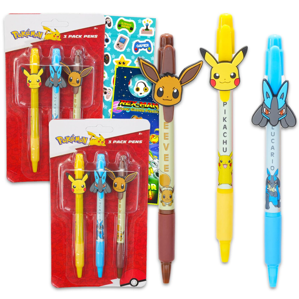 Pokemon Pen Set - 6 Pc Pokemon Ballpoint Pens Gift Bundle for Kids Featuring Pikachu Lucario and Eevee Plus Stickers More | Pokemon Party Favors f