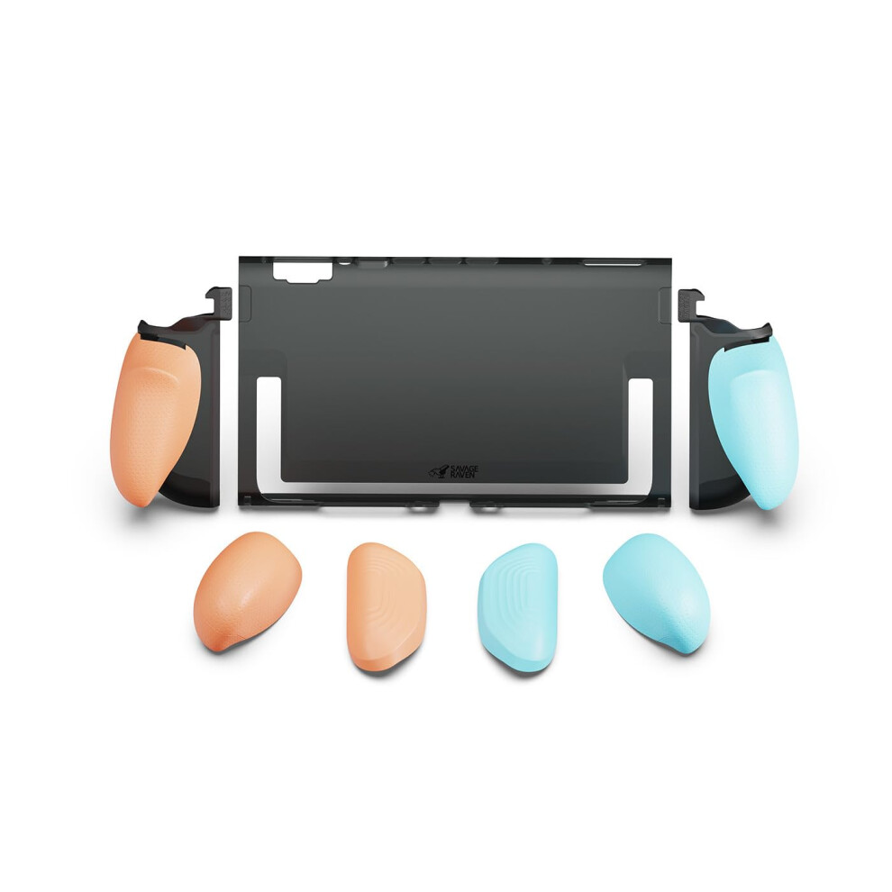 Skull & Co. GripCase OLED Bundle for Nintendo Switch OLED Model: A Dockable Transparent Protective Case with Interchangeable Grips [to fit All Hands Sizes] [with Carrying Case] - Neon Blue+Neon Red