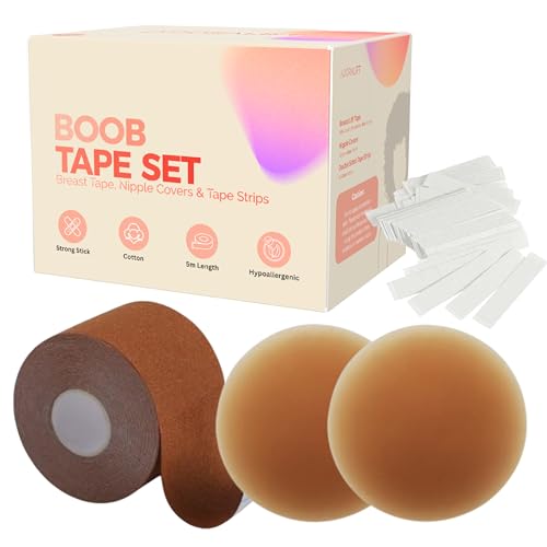 Adoralift Boob Tape Set - Fashion Tape, Boob Tape Push Up, Silicone Nipple Covers, Reusable Breast Pads, 30 Double-Sided Body Tape Strips, Waterproof Invisible Tape for Large & Small (Mocha)