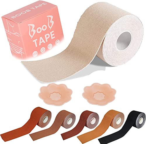 WROLY Boob Tape, Self-Adhesive Strapless Boobtapes, Bob Tape for Large Breasts with 2 Pcs Nipple Covers and Tape, Breast Lift Tape Stretchable Longer Than Regular Tape Rolls (Beige)