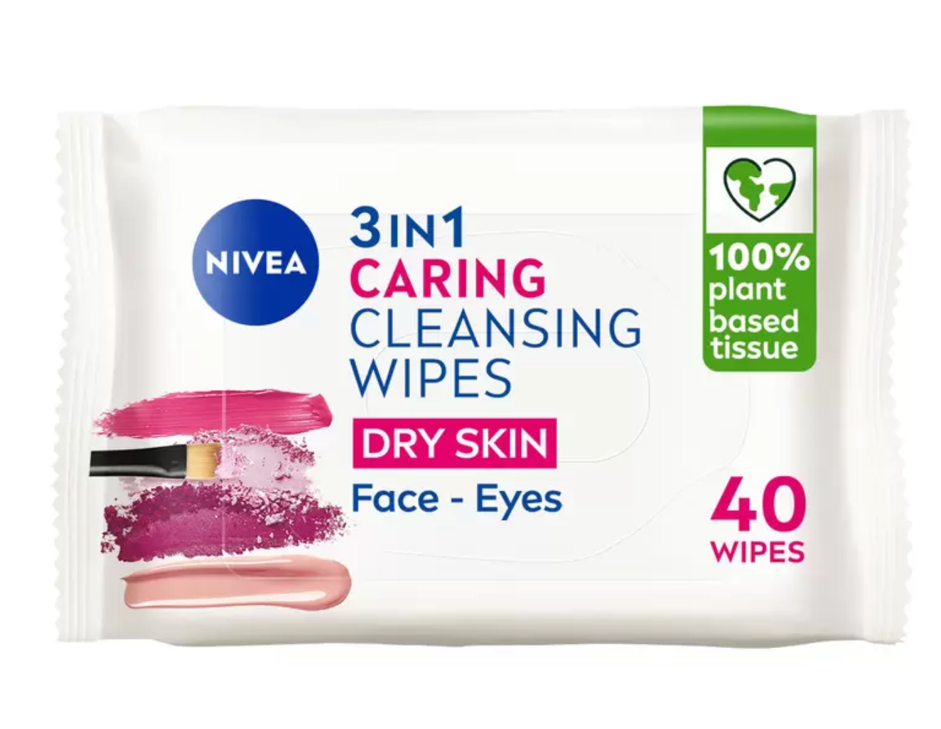 NIVEA 3In1 Caring Cleansing Wipes Dry Skin (40 Wipes), Plant-Based Makeup Remove