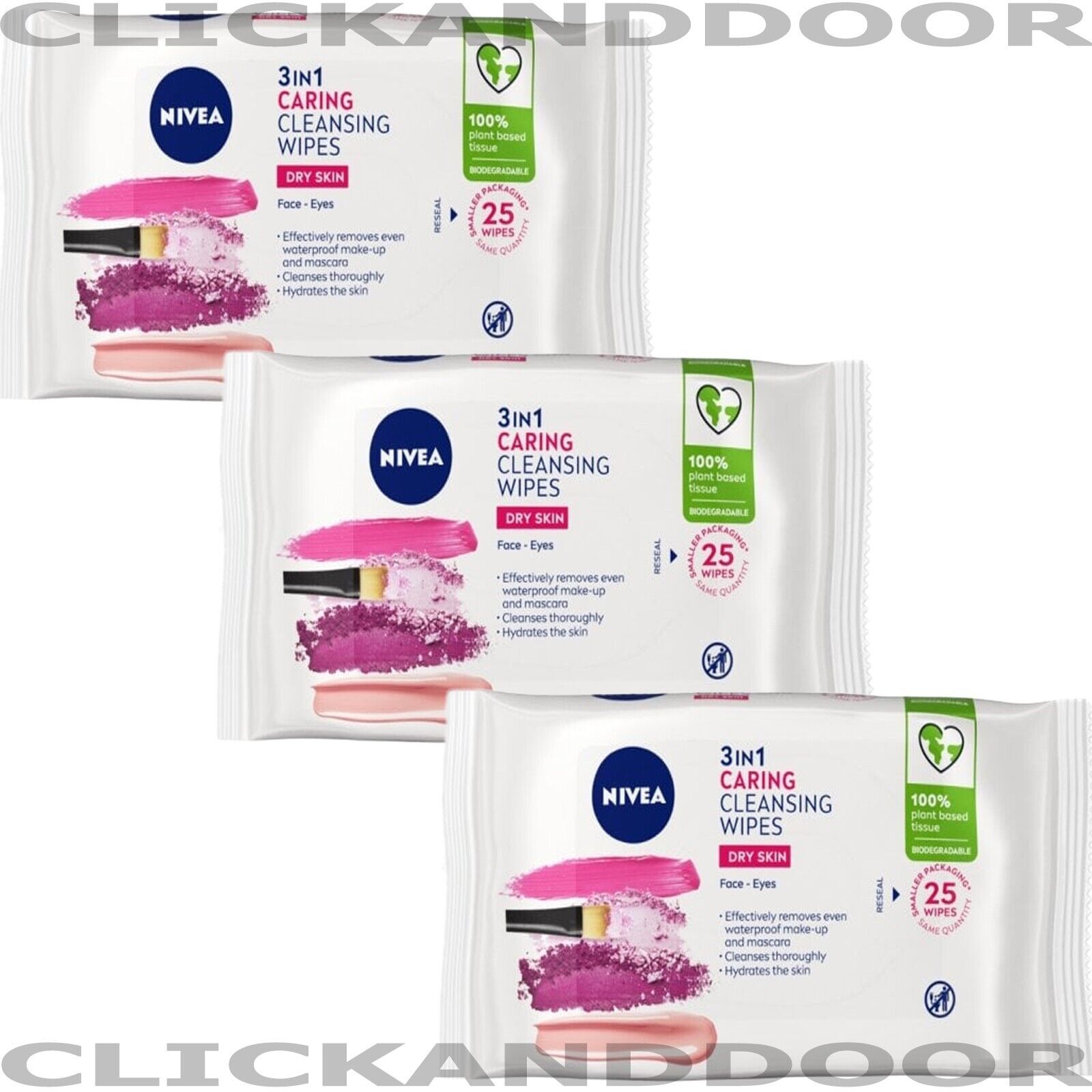 3 x NIVEA 3-in-1 CARING Cleansing Wipes for Dry Skin For face eyes 25 Wipes