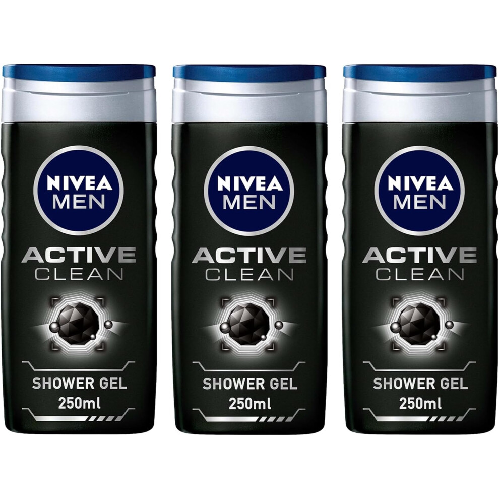 NIVEA MEN 3-in-1 Shower Gel Body Wash Active Clean with Charcoal 250ml Pack Of 3 | Woody Scent | Long-Lasting Masculine Fragrance | Bath Soap