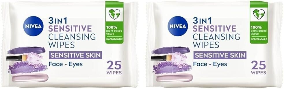 NIVEA 3in1 Sensitive Cleansing Wipes, Plant-Based Makeup Remover Wipe Pack Of 2