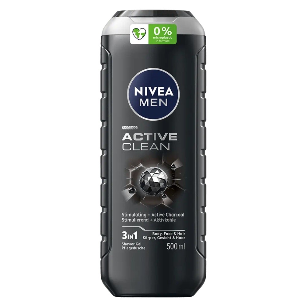 NIVEA Men Body Wash, Active Clean with Charcoal, Shower Gel for Body, Face & Hair, 250 ml