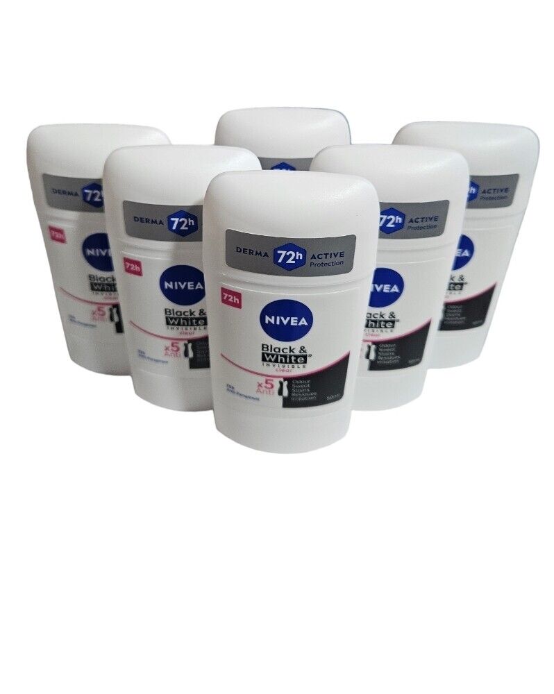 6 x NIVEA 72 Hrs Anti-Perspirant Black & White Invisible Clear Deo Stick 6x50ml