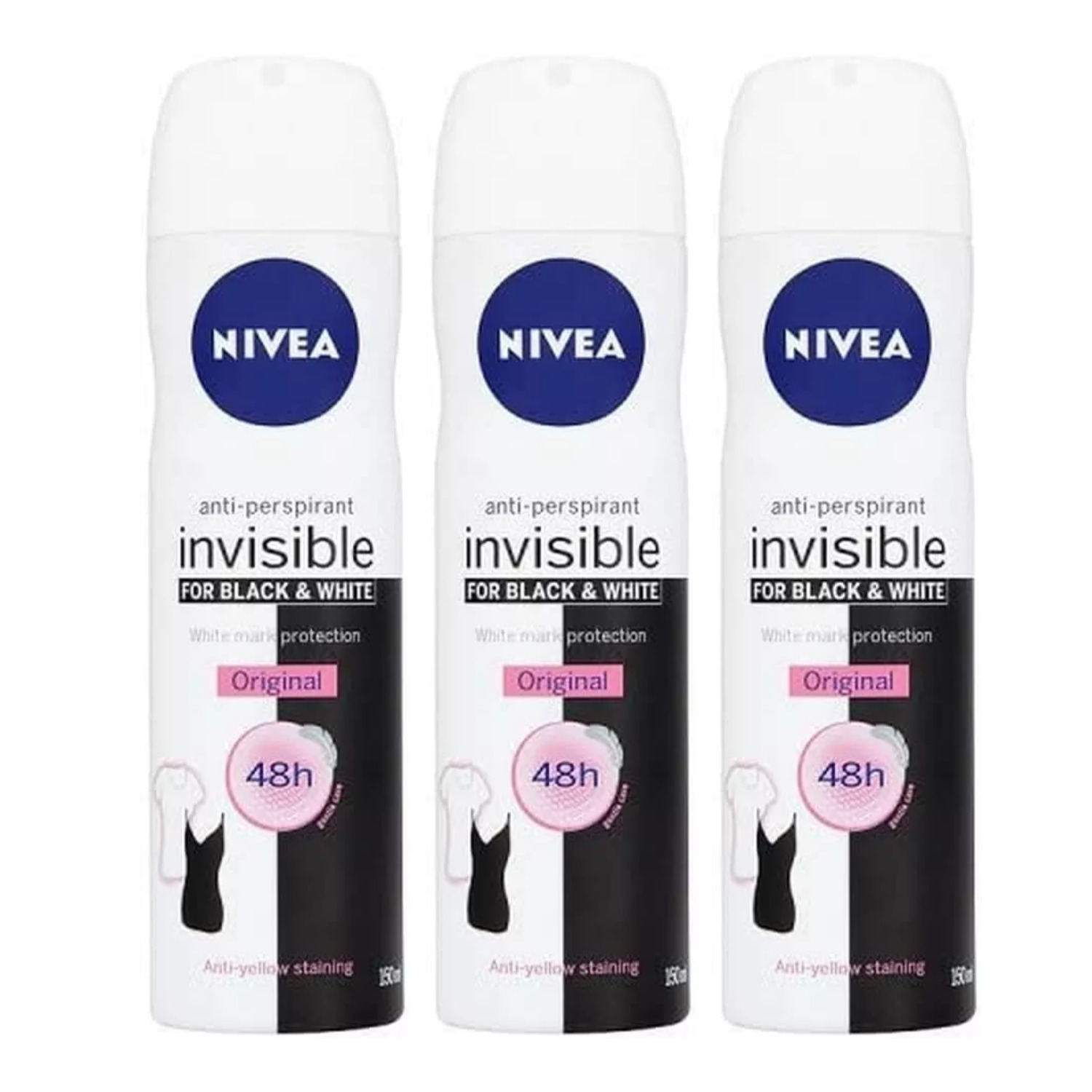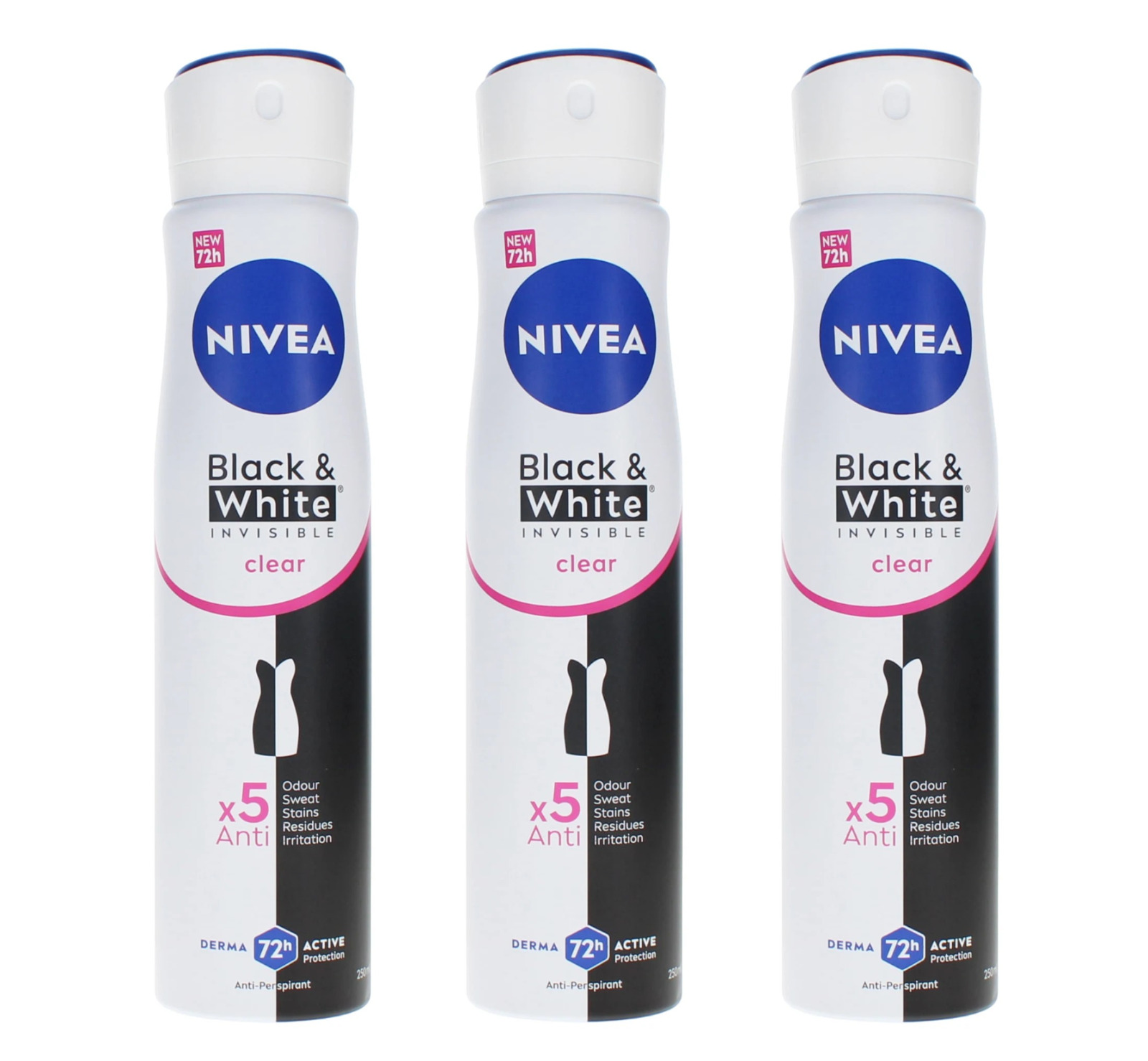 3 x 250ml Nivea Black & White Invisible Clear Anti-Perspirant Deodorant Spray