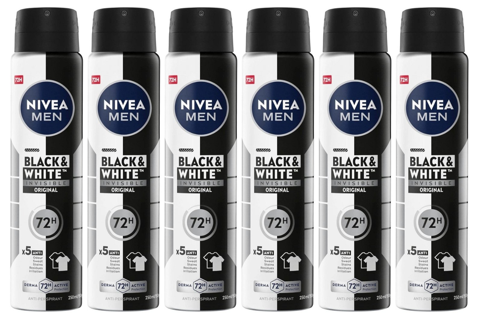 NIVEA Black & White Invisible Anti-Perspirant Spray Pack of 6 (6 x 250ml), 72hr Anti-Sweat Women's Deodorant Spray, No Stains on Black and White Clothes