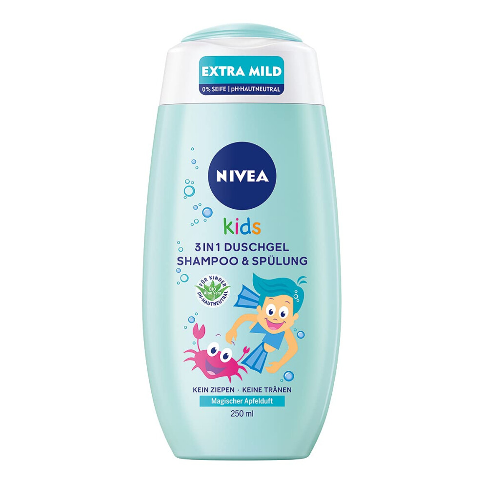 Nivea Kids 3-in-1 Shower Gel, Shampoo & Conditioner (250 ml), Care and Cleaning for Kids with Magic Apple Fragrance, Extra Mild & Soap-Free Hair and