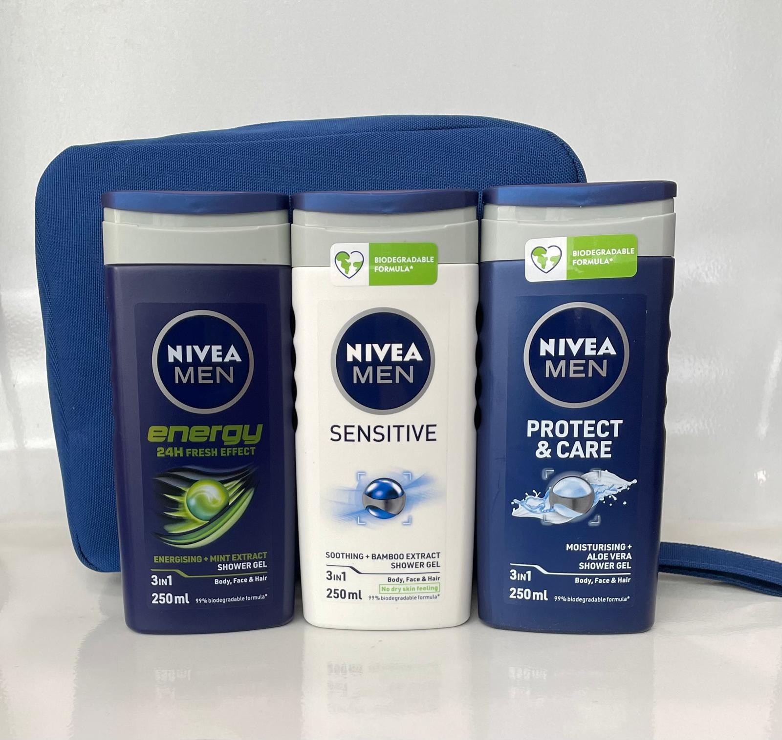 TRIO NIVEA MENGift Set 3x 250ml Shower Gel: Energy + Sensitive + Protect & Bag