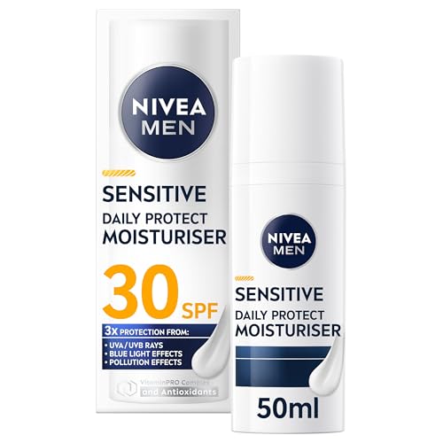 NIVEA MEN Sensitive Daily Protect Moisturiser SPF 30 (50ml), Moisturising Men's Face Cream Suitable For Sensitive Skin, Lightweight Face Moisturiser with UV Protection, Non-Greasy Formula