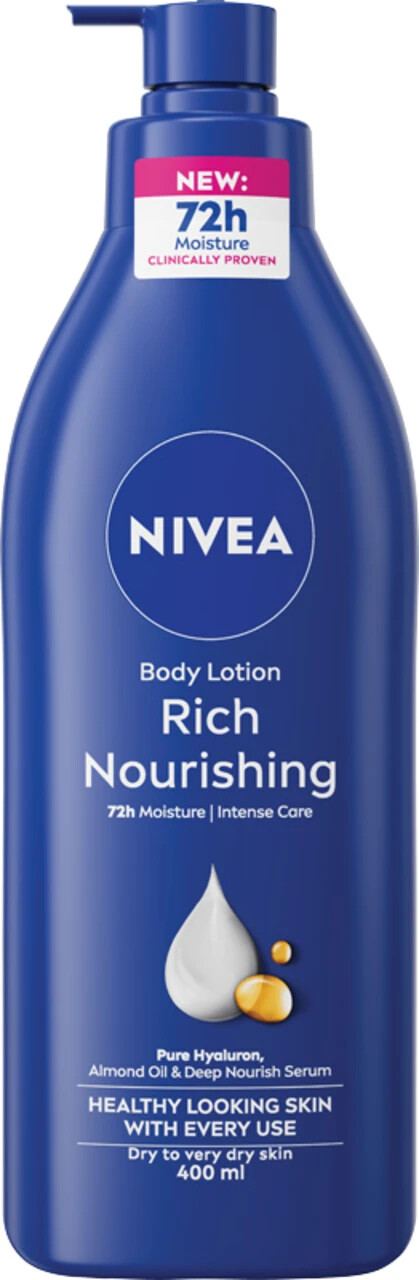 NIVEA Rich Nourishing Body Lotion (400ml), Rich 72H Hydration NIVEA Moisturiser for Dry Skin Made with Deep Moisture Serum and Almond Oil, Intensive Hydration NIVEA Body Lotion, Pack of 1