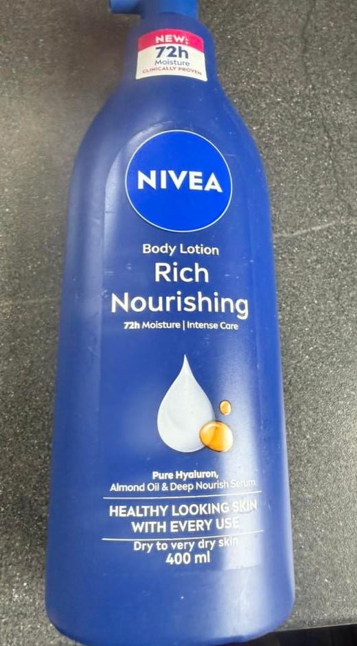 NIVEA Rich Nourishing Body Lotion (400ml), Rich 72H Hydration Moisturiser for Dry Skin Made with Deep Moisture Serum and Almond Oil, Intensive Hydration Body Lotion