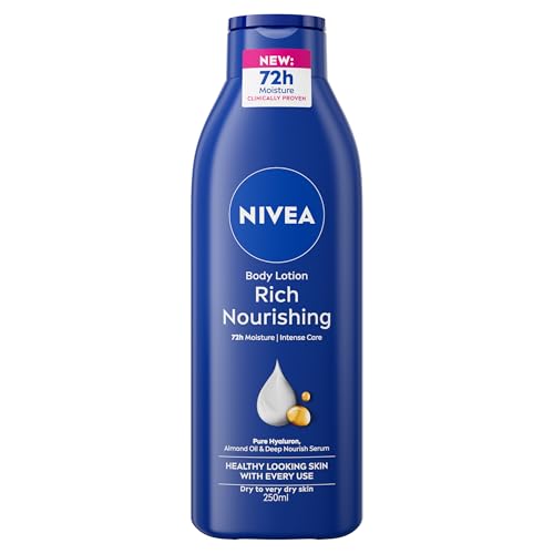 NIVEA Rich Nourishing Body Lotion (250ml), Rich 72H Hydration Moisturiser for Dry Skin Made with Deep Moisture Serum and Almond Oil, Intensive Hydration Body Lotion