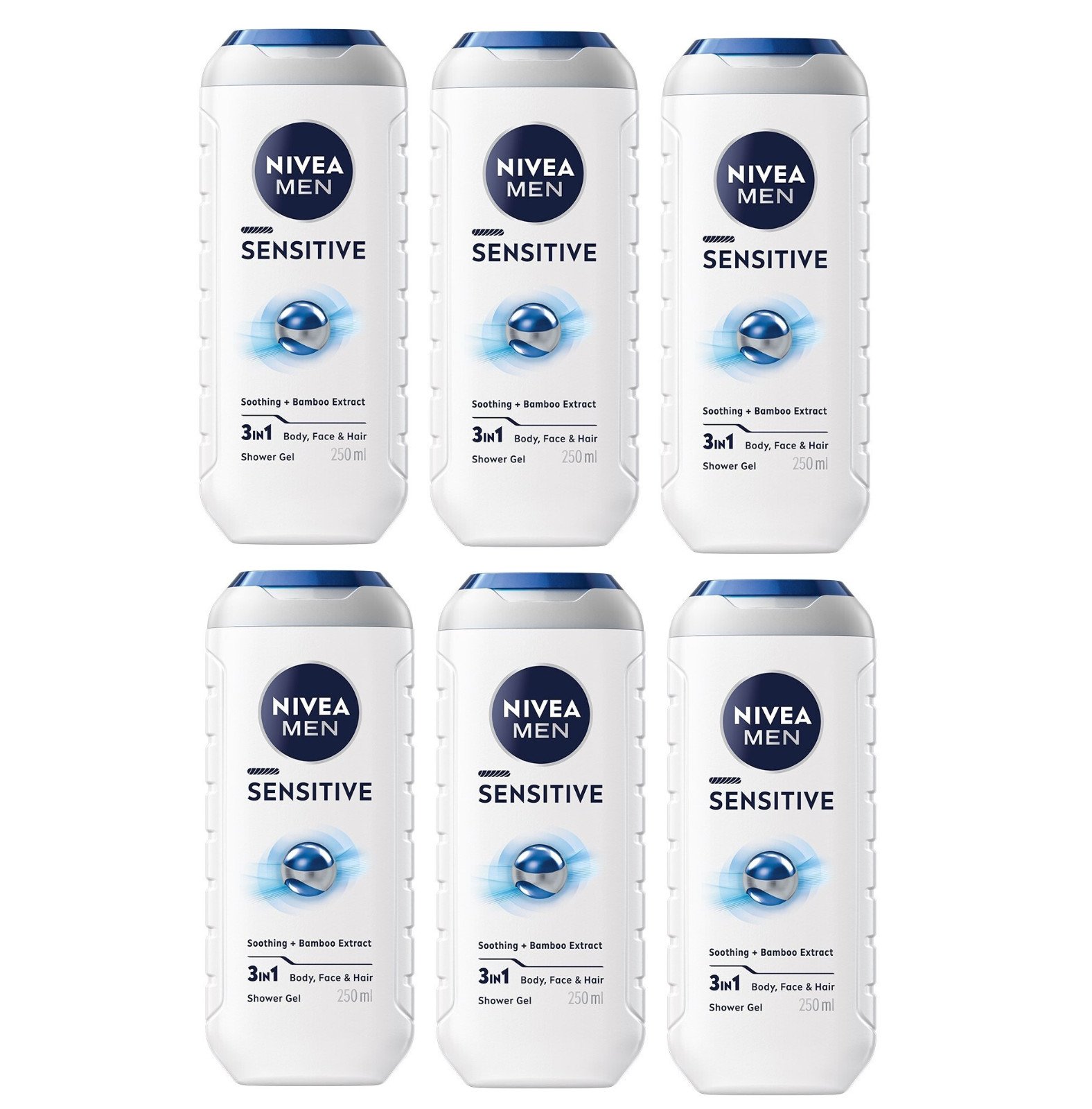 6x NIVEA MEN Sensitive Shower Gel 250ml, 3in1 ( Body Face &Hair)