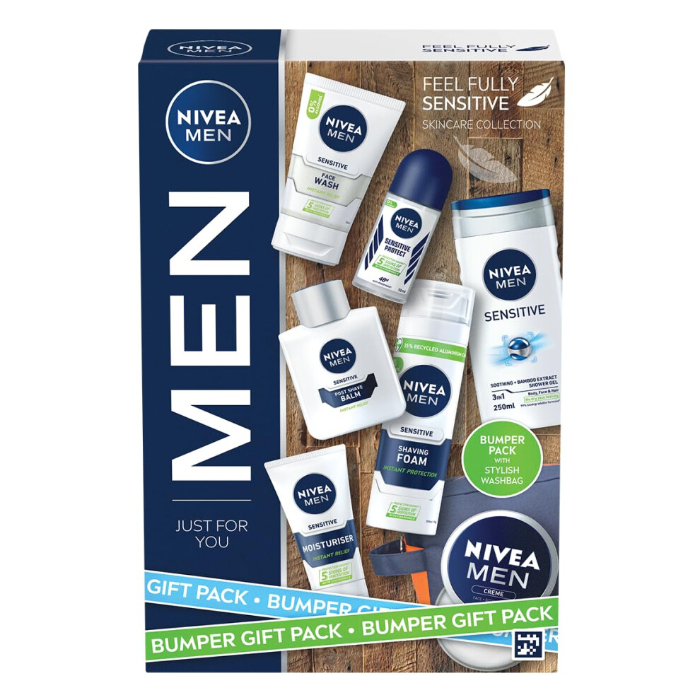 NIVEA MEN Feel Fully Sensitive Skincare Gift Set (8 Products), Includes Shower Gel, Anti-Perspirant, Face Wash, Shaving Foam, Post Shave Balm, Moisturisers, and Wash Bag