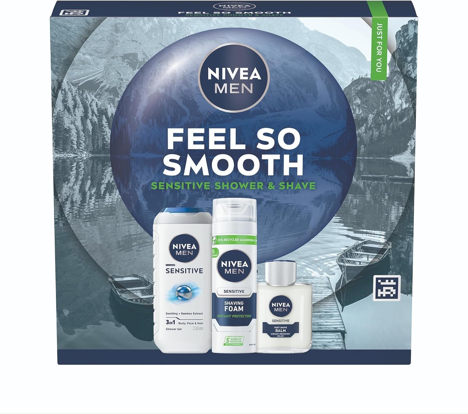 NIVEA MEN Feel So Smooth Skincare Gift Set (3 Products) - Men'sGift Set for Sensitive Skin – Includes Shower Gel, Shaving Foam, and Post Shave Balm