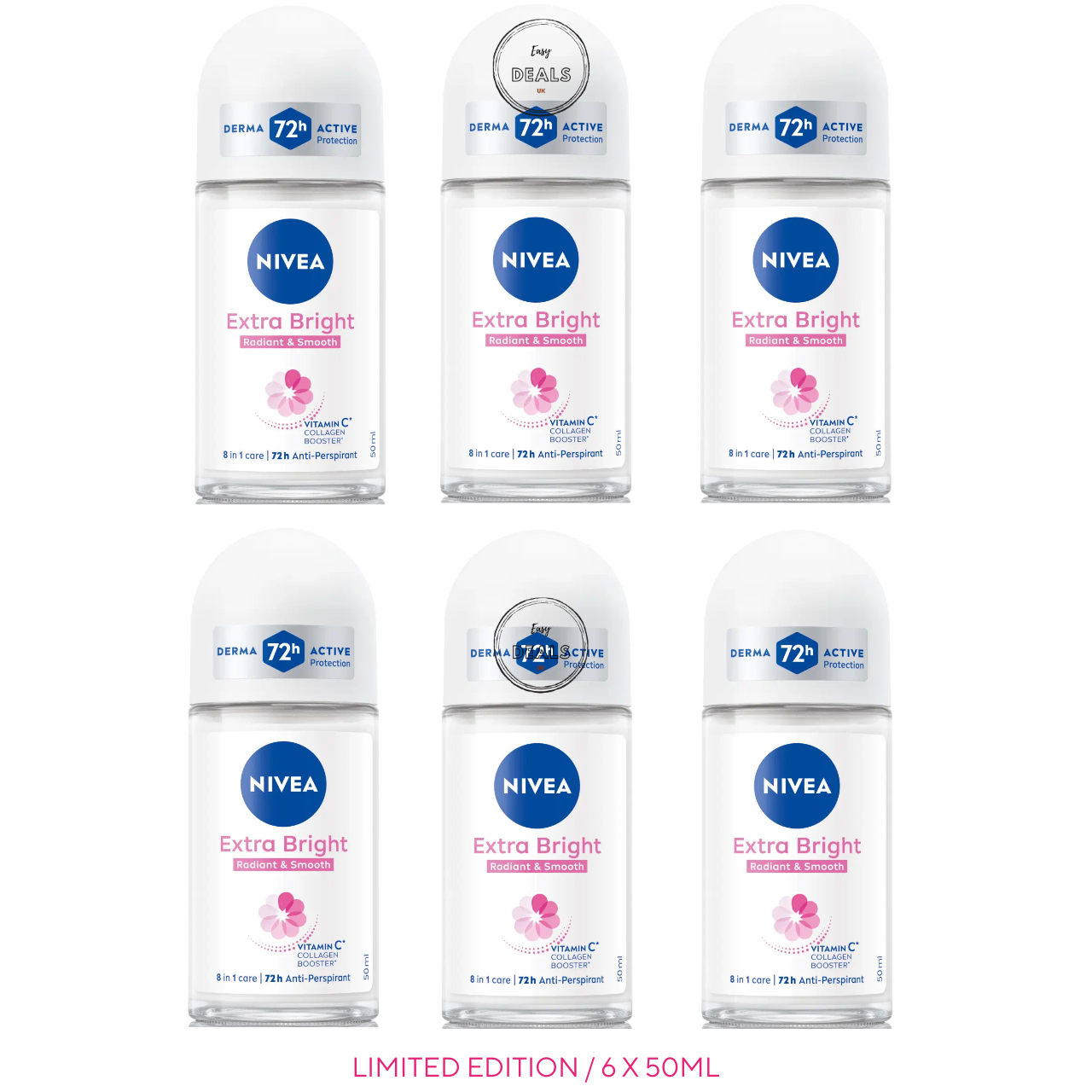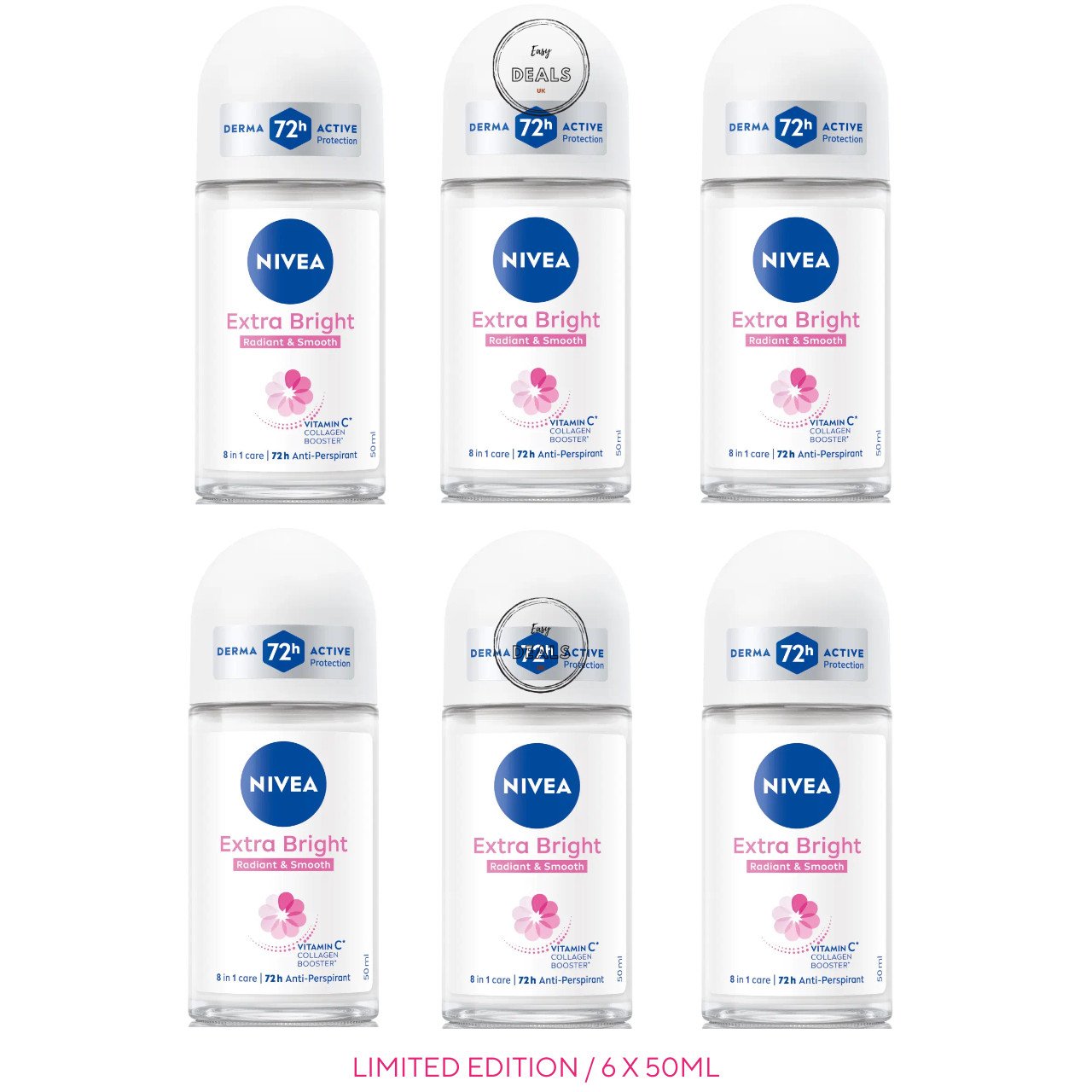 6 x50ml NIVEA Women's EXTRA BRIGHT RADIENT & SMOOTH Roll On Anti-Perspirant 72h