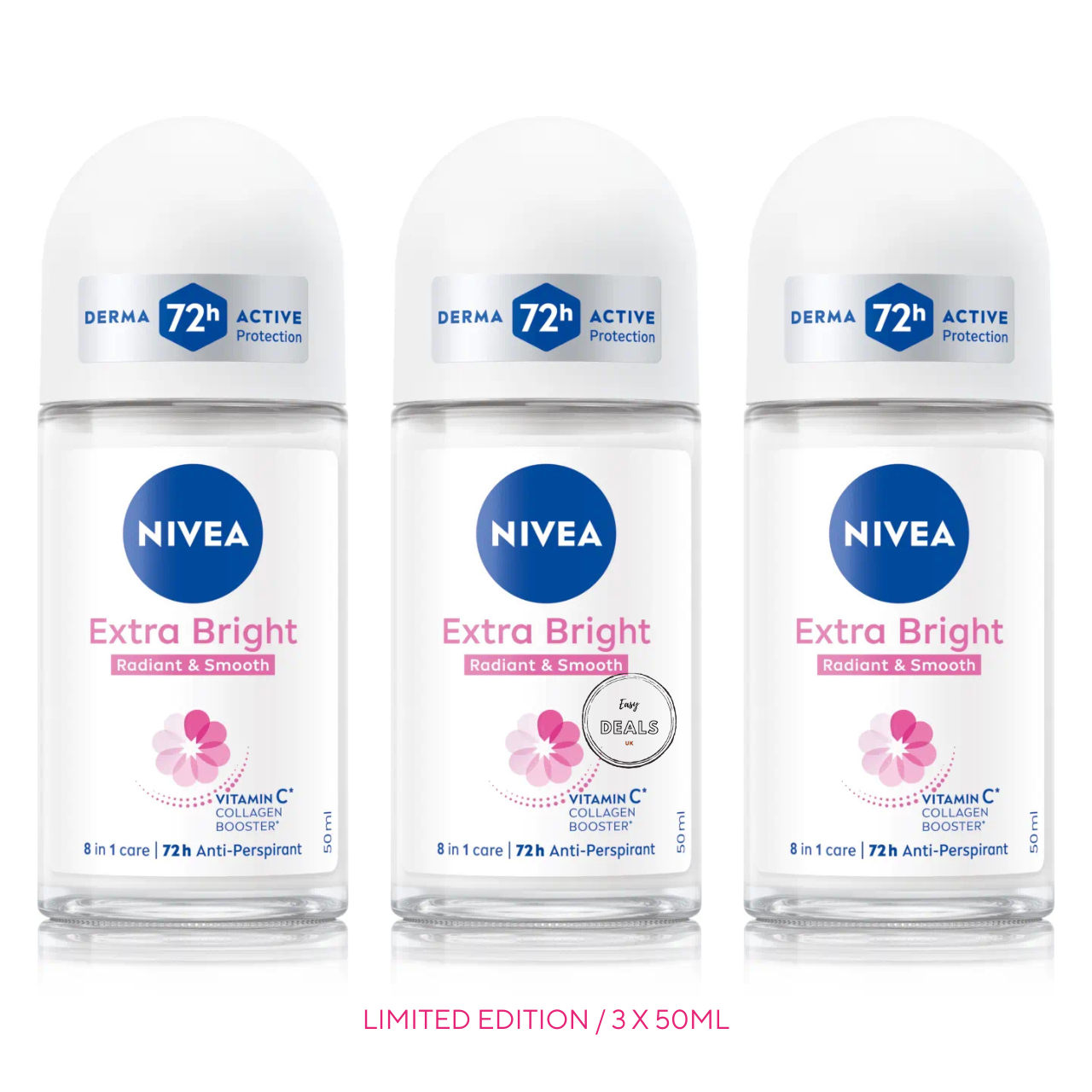 3 x50ml NIVEA Women's EXTRA BRIGHT RADIENT & SMOOTH Roll On Anti-Perspirant 72h