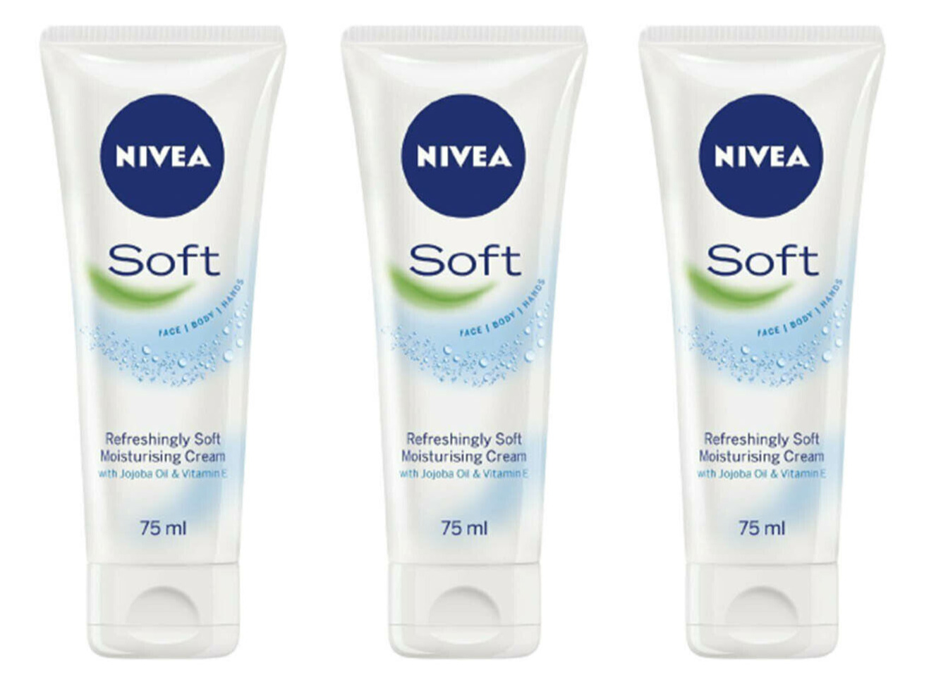NIVEA Soft Moisturising Cream Face Body Hands Jojoba Oil 3x 75ml moisturising
