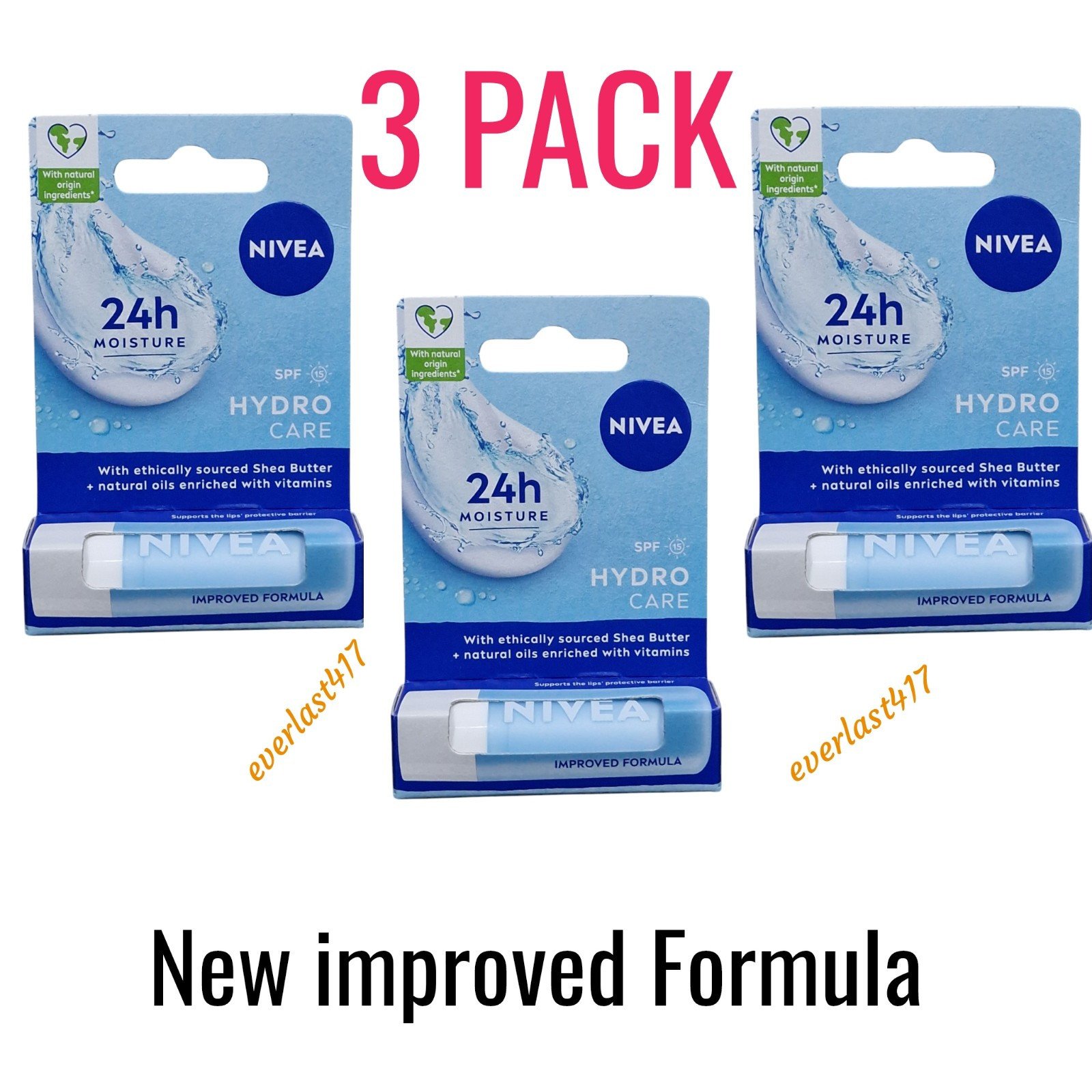 3x Nivea Hydro Care Hydrating Lip Balm 4.8g Long Lasting soft and comfortable