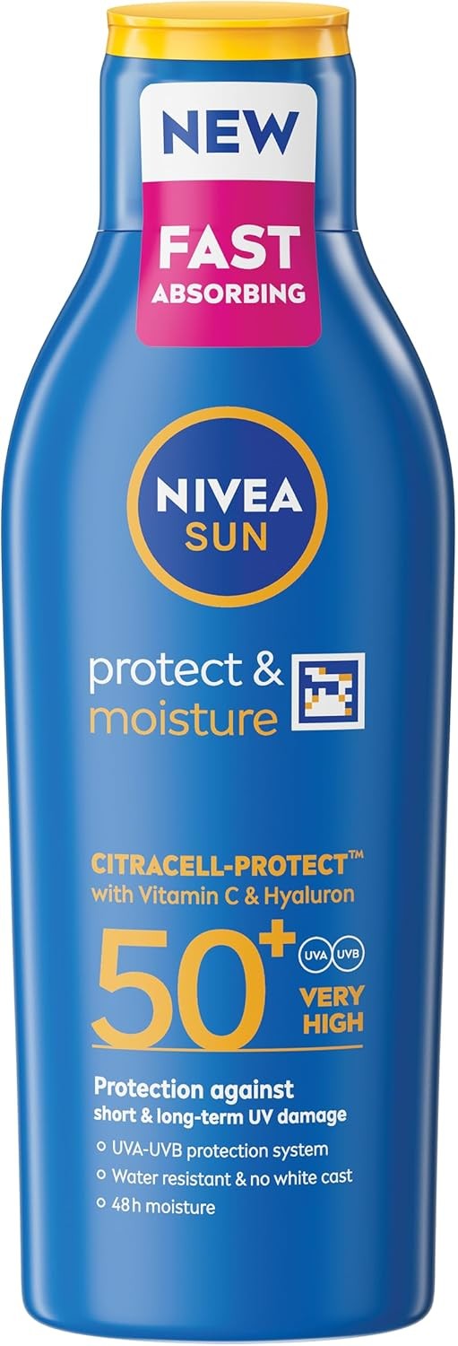 NIVEA SUN Protect & Moisture Sun Lotion SPF 50+ (200 ml), Suncream with Vitamin C and Hyaluron, Provides 48H Moisture and Immediate UVA/UVB Protection, Fast-Absorbing, No White Cast Formula