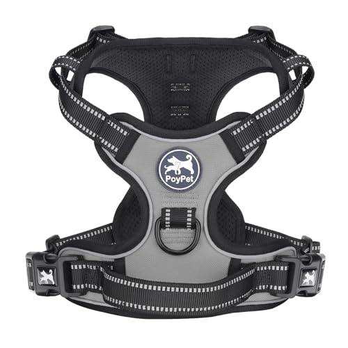 PoyPet No Pull Dog Harness, Reflective Vest Harness with 2 Leash Attachments and Easy Control Handle for Small Medium Large Dog(Grey,S)