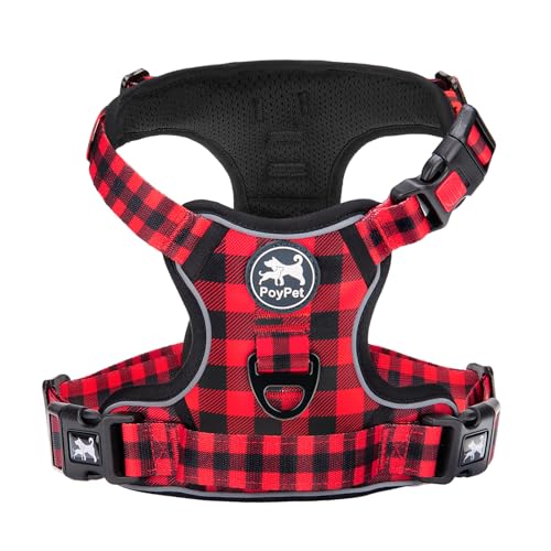 PoyPet No Pull Dog Harness, [Release on Neck] Reflective Adjustable No Choke Pet Vest with Front & Back 2 Leash Attachments, Soft Control Training Handle for Medium Dogs(Checkered Red,M)